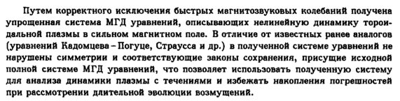 Путем корректного исключения быстрых мвгнитозвуковых колебаний получена упрощенная система МГД уравнений, описывающих нелинейную динамику тороидальной плазмы в сильном магнитном поле. В отличие от известных ранее аналогов (уравнений Кадомцева Погуце, Страусса и др.) в полученной системе уравнений не нарушены симметрии и соответствующие законы сохранения, присущие исходной полной системе МГД уравнений, что позволяет использовать полученную систему для анализа динамики плазмы с течениями и избежать накопления погрешностей при рассмотрении длительной эволюции возмущений.