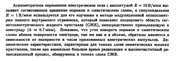 Асимметричное переменное электрическое поле с амплитудой Ε — 10В/мкм вызывает согласованное вращение нормали к смектическим слоям, а синусоидальное Ε = 1 В/мкм используется для его изучения в методе модуляционной эллипсомет-рии полного внутреннего отражения, который позволяет зондировать область сег-нетоэлектрического жидкого кристалла (СЖК), непосредственно примыкающую к электроду (h sa 0.7 мкм). Показано, что угол поворота нормали к смектическим слоям вблизи поверхности электрода, так же как и в объеме, обратимо меняется в зависимости от полярности и числа приложенных электрических импульсов. Динамические характеристики, характерные для тонких слоев нематических жидких кристаллов, такие как аномально большое время релаксации и высокочастотный релаксационный процесс, обнаружены в тонких слоях СЖК.