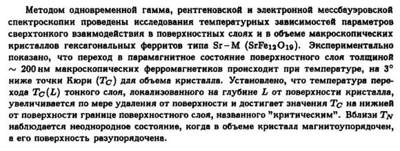 Методом одновременной гамма, рентгеновской и электронной мессбауэровской спектроскопии проведены исследования температурных зависимостей параметров сверхтонкого взаимодействия в поверхностных слоях и в объеме макроскопических кристаллов гексагональных ферритов типа Sr-M (SrPeijOie). Экспериментально показано, что переход в парамагнитное состояние поверхностного слоя толщиной ~ 200 нм макроскопических ферромагнетиков происходит при температуре, на 3° ниже точки Кюри (Тс) для объема кристалла. Установлено, что температура перехода Tc(L) тонкого слоя, локализованного на глубине L от поверхности кристалла, увеличивается по мере удаления от поверхности и достигает значения Тс на нижней от поверхности границе поверхностного слоя, названного "критическим". Вблизи Ts наблюдается неоднородное состояние, когда в объеме кристалл магнитоупорядочен, а его поверхность разупорядочена.