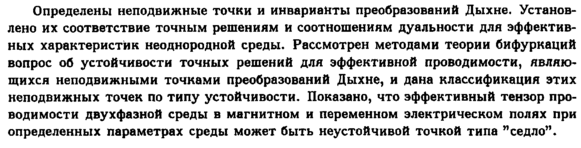 Определены неподвижные точки и инварианты преобразований Дыхне. Установлено их соответствие точным решениям и соотношениям дуальности для эффективных характеристик неоднородной среды. Рассмотрен методами теории бифуркаций вопрос об устойчивости точных решений для эффективной проводимости, являющихся неподвижными точками преобразований Дыхне, и дана классификация этих неподвижных точек по типу устойчивости. Показано, что эффективный тензор проводимости двухфазной среды в магнитном и переменном электрическом полях при определенных параметрах среды может быть неустойчивой точкой типа "седло".
