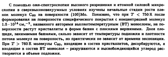 С помощью оже-спектроскопии высокого разрешения и атомной силовой микроскопии в сверхвысоковакуумных условиях изучены начальные стадии роста пленок молекул Ceo на поверхности (ЮО)Мо. Показано, что при Τ < 750 К после формирования на поверхности специфического покрытия с концентрацией молекул 1.5 ' 1014см,-2, названного авторами высокотемпературным (ВТ) монослоем, на поверхности растут кристаллиты в форме башен с плоскими вершинами. Доля площади, занимаемая башнями, сильно зависит от температуры подложки и плотности потока молекул на поверхность, но практически не зависит от времени экспозиции. При Τ > 760 К молекулы Сво> входящие в состав кристаллитов, десорбируются, а входящие в состав ВТ монослоя разрушаются и высвобождающийся углерод растворяется в объеме подложки.