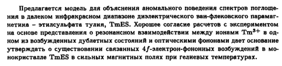 Предлагается модель для объяснения аномального поведения спектров поглощения в далеком инфракрасном диапазоне диэлектрического ван-флековского парамагнетика зтилсульфата тулия, TmES. Хорошее согласие расчетов с экспериментом на основе представления о резонансном взаимодействии между ионами Тт3+ в одном из возбужденных дублетных состояний и оптическими фононами дает основание утверждать о существовании связанных 4/-электрон-фононных возбуждений в монокристалле TmES в сильных магнитных полях при гелиевых температурах.