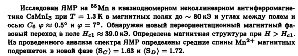Исследован ЯМР на 55Μη в квазиодномерном неколлинеарном антиферромагнетике СзМп1з при X = 1.3 К в магнитных полях до ~ 80 кЭ и углах между полем и осью Се φ « 0.5° и φ = 7°. Обнаружен новый переориентационный магнитный фазовый переход в поле Нс\ 39.0кЭ. Определена магнитная структура при Η > Нс\. Из проведенного анализа спектра ЯМР определены средние спины Мп2+ магнитных подрешеток в новой фазе (So) = 1-63 и (So) = 1.72.