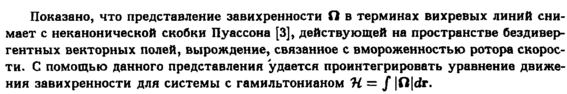 Показано, что представление завихренности Ω в терминах вихревых линий снимает с неканонической скобки Пуассона [3], действующей на пространстве бездивергентных векторных полей, вырождение, связанное с вмороженностью ротора скорости. С помощью данного представления удается проинтегрировать уравнение движения завихренности для системы с гамильтонианом % = f |Ω|Α\