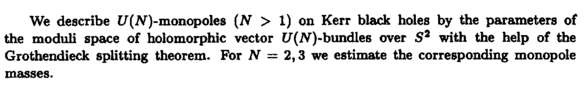 We describe t/(N)-monopoles (N > 1) on Kerr black holes by the parameters of the moduli space of holomorphic vector U(N)-bundles over S2 with the help of the Grothendieck splitting theorem. For N — 2,3 we estimate the corresponding monopole masses.