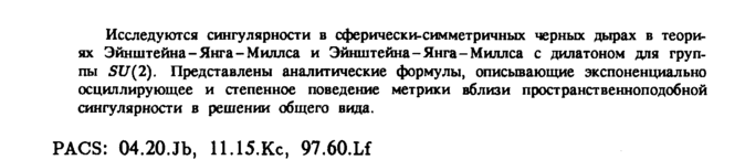Исследуются сингулярности в сферически-симметричных черных дырах в теориях Эйнштейна-Янга-Μиллса и Эйнштейна-Янга-Μ иллса с дилатоном для группы 517(2). Представлены аналитические формулы, описывающие экспоненциально осциллирующее и степенное поведение метрики вблизи прост ранет венноподобной сингулярности в решении общего вида. PACS: 04.20.Jb, ll.15.Kc, 97.60.Lf