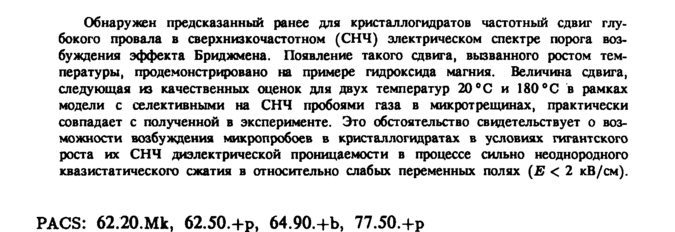 Обнаружен предсказанный ранее для кристаллогидратов частотный сдвиг глубокого провала в сверхнизкочастотном (СНЧ) электрическом спектре порога возбуждения эффекта Бриджмена. Появление такого сдвига, вызванного ростом температуры, продемонстрировано на примере гидроксида магния. Величина сдвига, следующая из качественных оценок для двух температур 200С и 180 °С в рамках модели с селективными на СНЧ пробоями газа в микротрещинах, практически совпадает с полученной в эксперименте. Это обстоятельство свидетельствует о возможности возбуждения микропробоев в кристаллогидратах в условиях гигантского роста их СНЧ диэлектрической проницаемости в процессе сильно неоднородного квазистатического сжатия в относительно слабых переменных полях (Е < 2 кВ/см). PACS: 62.20.Mk, 62.50,+р, 64.90.+Ь, 77.50.+р