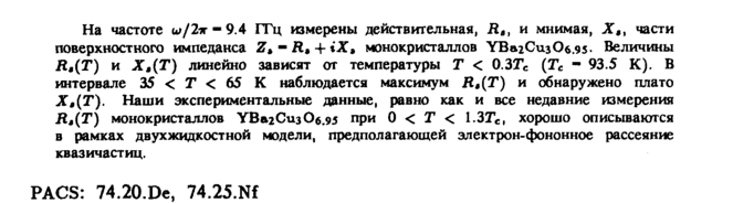На частоте ω/2*·-9.4 ГГц измерены действительная, Нл, и мнимая, XSt части поверхностного импеданса Z, -Я, + монокристаллов YBa2Cu.3O6.95. Величины Я,(Г) и Х,(Т) линейно зависят от температуры Τ < 0.3ГС (Те 93.5 К). В интервале 35 < Τ < 65 К наблюдается максимум А«(Т) и обнаружено плато Ха(Т). Наши экспериментальные данные, равно как и все недавние измерения R»(T) монокристаллов УВагСизОб.95 при 0 < Г < 1.3Ге, хорошо описываются в рамках двух жидкостной модели, предполагающей электрон-фононное рассеяние квазичастиц. PACS: 74.20.De, 74.25.Nf