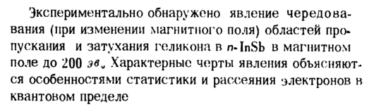 Экспериментально обнаружено явление чередова-вания (при изменении магнитного поля) областей пропускания и затухания геликона в n-InSb в магнитном поле до 200 эв„ Характерные черты явления объясняются особенностями статистики и рассеяния электронов в квантовом пределе