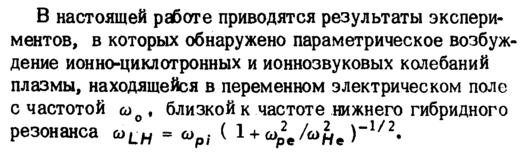 В настоящей работе приводятся результаты экспериментов, в которых обнаружено параметрическое возбуждение ионно-циклотронных и ионнозвуковых колебаний плазмы, находящейся в переменном электрическом поле с частотой ωο , близкой к частоте нижнего гибридного резонанса &>LH ωρί ( 1 + ωρ2β/ω£β )"1/2·