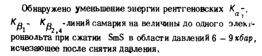 Обнаружено уменьшение энергии рентгеновских К -, Κβ^ Κβ^ -линий самария на величины до одного электронвольта при сжатии SmS в области давлений 6 Укбар, исчезающее после снятия давления.