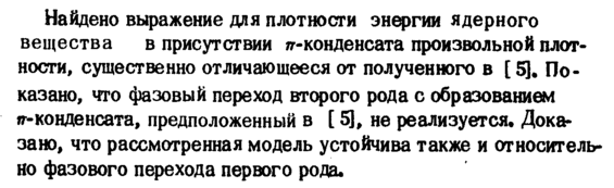 Найдено выражение для плотности энергии ядерного вещества в присутствии π-конденсата произвольной плотности, существенно отличающееся от полученного в [ 5). Показано, что фазовый переход второго рода с образованием «^конденсата, предположенный в [ 5), не реализуется. Доказано, что рассмотренная модель устойчива также и относительно фазового перехода первого рода.