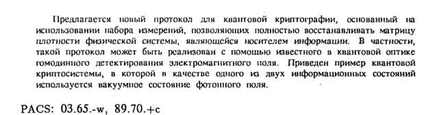Предлагается новый протокол для квантовой криптографии, основанный на использовании набора измерений, позволяющих полностью восстанавливать матрицу плотности физической системы, являющейся носителем информации. В частности, такой протокол может быть реализован с помощью известного в квантовой оптике гомодинного детектирования электромагнитного поля. Приведен пример квантовой криптосистемы, в которой η качестве одного из двух информационных состояний используется вакуумное состояние фотонного поля. PACS: 03.65.-w, 89.70.+с