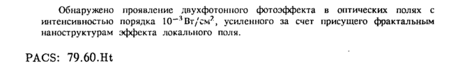 Обнаружено проявление двухфотонного фотоэффекта в оптических полях с интенсивностью порядка 10"3Вт/см7, усиленного за счет присущего фрактальным наноструктурам эффекта локального поля. PACS: 79.60.Ht
