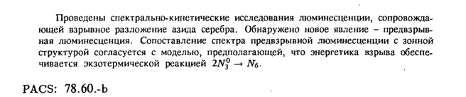Проведены спектрально-кинетические исследования люминесценции, сопровождающей взрывное разложение азида серебра. Обнаружено новое явление предвзрыв-ная люминесценция. Сопоставление спектра предвзрывной люминесценции с зонной структурой согласуется с моделью, предполагающей, что энергетика взрыва обеспечивается экзотермической реакцией 2N® —* Щ. PACS: 78.60.-b