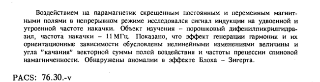 Воздействием на парамагнетик скрещенным постоянным и переменным магнитными полями в непрерывном режиме исследовался сигнал индукции на удвоенной и утроенной частоте накачки. Объгкт изучения порошковый дифенилпикрилгидра-зил, частота накачки 11МГц. Показано, что эффект генерации гармоник и их ориентационные зависимости обусловлены нелинейными изменениями величины и угла "качания" векторной суммы полей воздействия и частоты прецессии спиновой намагниченности. Обнаружены аномалии в эффекте Блоха Зигерта. PACS: 76.30.-v