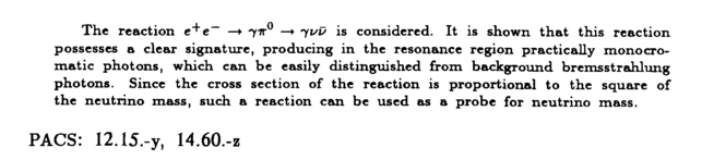 The reaction e~*"e~ —► ~fir° —* yvv is considered. It is shown that this reaction possesses a clear signature, producing in the resonance region practically monocro-matic photons, which can be easily distinguished from background bremsstrahlung photons. Since the cross section of the reaction is proportional to the square of the neutrino mass, such a reaction can be used as a probe for neutrino mass. PACS: 12.15.-y, 14.60.-z