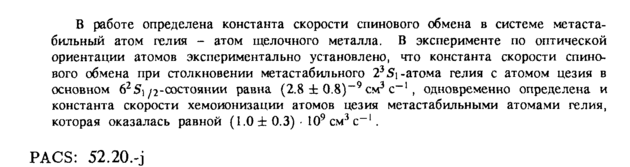 В работе определена константа скорости спинового обмена в системе метаста-бильный атом гелия атом щелочного металла. В эксперименте по оптической ориентации атомов экспериментально установлено, что константа скорости спинового обмена при столкновении метастабильного 23 Si-атома гелия с атомом цезия в основном б2S] μ-0^0*11™ равна (2.8 ± 0.8)-' см3 с-1 , одновременно определена и константа скорости хемоионизации атомов цезия метастабильными атомами гелия, которая оказалась равной (1.0 ± 0.3) · 109 см3 с-1. PACS: 52.20.-j