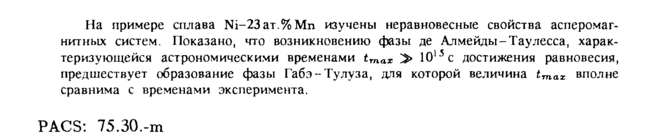 На примере сплава Ni-23aT.%Mn изучены неравновесные свойства асперомаг-нитных систем. Показано, что возникновению фазы де Алмейды-Таулесса, характеризующейся астрономическими временами £mai > 1015с достижения равновесия, предшествует образование фазы Габэ-Тулуза, для которой величина tmax вполне сравнима с временами эксперимента. PACS: 75.30.-m