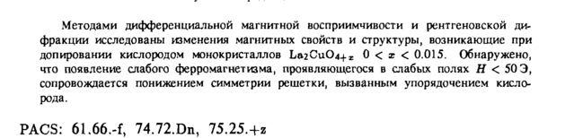 Методами дифференциальной магнитной восприимчивости и рентгеновской дифракции исследованы изменения магнитных свойств и структуры, возникающие при допировании кислородом монокристаллов ЬагСиО^я 0 < χ < 0.015. Обнаружено, что появление слабого ферромагнетизма, проявляющегося в слабых полях Η < 50 Э, сопровождается понижением симметрии решетки, вызванным упорядочением кислорода. PACS: 61.66.-f, 74.72.Dn, 75.25.+Z
