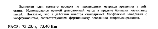 Вычислен член третьего порядка по производным матрицы вращения в действии. Использовался прямой диаграммный метод в пределе больших магнитных полей. Показано, что в действии имеется стандартный Хопфовский инвариант с коэффициентом, соответствующем фермионному поведению вихрей-скирмионов. PACS: 73.20.-r, 73.40.Hm