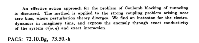An effective action approach for the problem of Coulomb blocking of tunneling is discussed. The method is applied to the strong coupling problem arising near zero bias, where perturbation theory diverges. We find an instant on for the electrodynamics in imaginary time, and express the anomaly through exact conductivity of the system σ(ω} q) and exact interaction, PACS: 72.10.Bg, 73.50.-h
