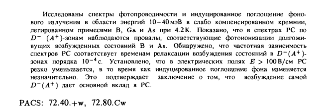 Исследованы спектры фотопроводимости и индуцированное поглощение фонового излучения в области энергий 10-40мэВ в слабо компенсированном кремнии, легированном примесями В, Ga и As при 4.2К. Показано, что в спектрах PC по D~ (А+ )-зонам наблюдаются провалы, соответствующие фотоионизации долгожи-вущих возбужденных состояний В и As. Обнаружено, что частотная зависимость спектров PC соответствует временам релаксации возбуждения состояний в D~(A+)-зонах порядка Ю-4 с. Установлено, что в электрических полях Ε > 100 В/см PC резко уменьшается, в то время как индуцированное поглощение фона изменяется незначительно. Это подтверждает заключение о том, что возбуждение самой D~(A+) дает основной вклад в PC. PACS: 72.40,+w, 72.80.Cw