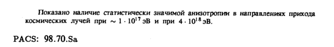 Показано наличие статистически значимой анизотропии в направлениях прихода космических лучей при ~ 1 · 10" эВ и при 4· 10