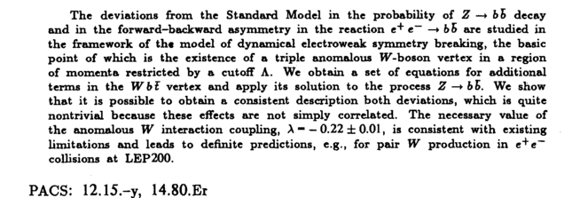 The deviations from the Standard Model in the probability of Ζ —» øÿ decay and in the forward-backward asymmetry in the reaction e+ e~ —* øâ are studied in the framework of th« model of dynamical electroweak symmetry breaking, the basic point of which is the existence of a triple anomalous W-boson vertex in a region of momenta restricted by a cutoff Λ. We obtain a set of equations for additional terms in the Wbl vertex and apply its solution to the process Ζ —► øå. We show that it is possible to obtain a consistent description both deviations, which is quite nontrivial because these effects are not simply correlated. The necessary value of the anomalous W interaction coupling, λ — 0.22 ± 0.01, is consistent with existing limitations and leads to definite predictions, e.g., for pair W production in e+e~ collisions at LEP200. PACS: 12.15.-y, 14.80.Er