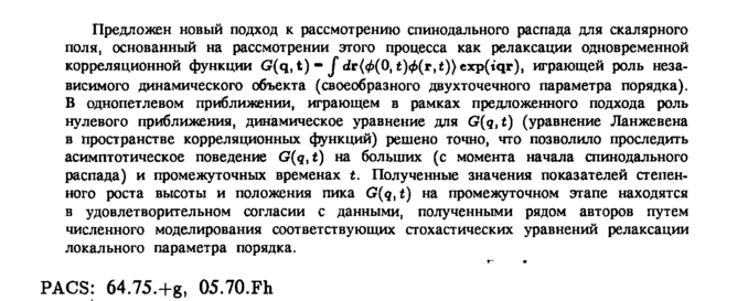 Предложен новый подход к рассмотрению спинодального распада для скалярного поля, основанный на рассмотрении этого процесса как релаксации одновременной корреляционной функции G(q,t)J άτ{φ(0, t)#(r,t)) exp(tqr), играющей роль независимого динамического объекта (своеобразного двухточечного параметра порядка). В однопетлевом приближении, играющем в рамках предложенного подхода роль нулевого приближения, динамическое уравнение для G(q,t) (уравнение Ланжевена в пространстве корреляционных функций) решено точно, что позволило проследить асимптотическое поведение G(g,t) на больших (с момента начала спинодального распада) и промежуточных временах t. Полученные значения показателей степенного роста высоты и положения пика G(q,t) на промежуточном этапе находятся в удовлетворительном согласии с данными, полученными рядом авторов путем численного моделирования соответствующих стохастических уравнений релаксации локального параметра порядка. PACS: 64.75.+g, 05.70.Fh
