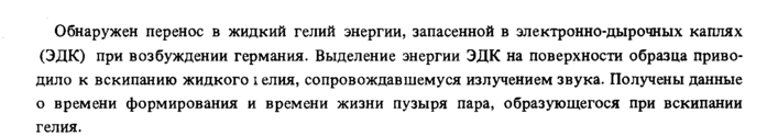 Обнаружен перенос в жидкий гелий энергии, запасенной в электронно-дырочных каплях (ЭДК) при возбуждении германия. Выделение энергии ЭДК на поверхности образца приводило к вскипанию жидкого 1елия, сопровождавшемуся излучением звука. Получены данные о времени формирования и времени жизни пузыря пара, образующегося при вскипании гелия.