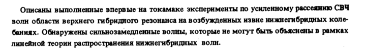 Описаны выполненные впервые на токамаке эксперименты по усиленному рассеянию СВЧ волн области верхнего гибридного резонанса на возбужденных извне нижнегибридных колебаниях. Обнаружены сильнозамедленные волны, которые не могут быть объяснены в рамках линейной теории распространения нижнегибридных волн.