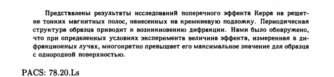 Представлены результаты исследований поперечного эффекта Керра на решетке тонких магнитных полос, нанесенных на кремниевую подложку. Периодическая структура образца приводит к возникновению дифракции. Нами было обнаружено, что при определенных условиях эксперимента величина эффекта, измеренная в дифракционных лучах, многократно превышает его максимальное значение для образца с однородной поверхностью. PACS: 78.20.Ls