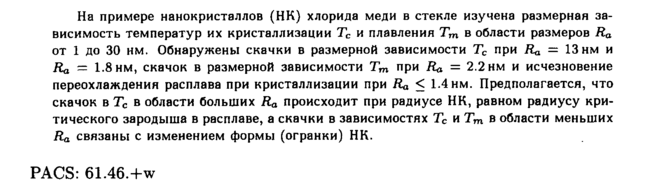 На примере нанокристаллов (НК) хлорида меди в стекле изучена размерная зависимость температур их кристаллизации Тс и плавления Тт в области размеров Ra от 1 до 30 нм. Обнаружены скачки в размерной зависимости Тс при Ra = 13 нм и Ra — 1.8 нм, скачок в размерной зависимости Тт при Ra = 2.2 нм и исчезновение переохлаждения расплава при кристаллизации при Ra < 1.4 нм. Предполагается, что скачок в Тс в области больших Ra происходит при радиусе НК, равном радиусу критического зародыша в расплаве, а скачки в зависимостях Тс и Тт в области меньших Да связаны с изменением формы (огранки) НК. PACS: 61.46.+W