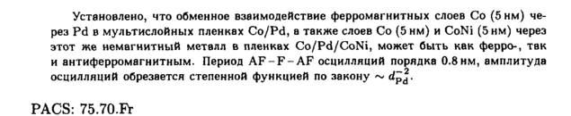 Установлено, что обменное взаимодействие ферромагнитных слоев Со (5 нм) через Pd в мультислойных пленках Co/Pd, а также слоев Со (5нм) и CoNi (5нм) через этот же немагнитный металл в пленках Co/Pd/CoNi, может быть как ферро-, так и антиферромагнитным. Период AF-F-AF осцилляций порядка 0.8нм, амплитуда осцилляции обрезается степенной функцией по закону ~ dp^. PACS: 75.70.Fr