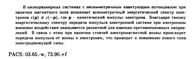 В низкоразмерных системах с несимметричным квантующим потенциалом при наличии магнитного поля возникает асимметричный энергетический спектр электронов ε(ρ) φ ε(—ρ), где ρ кинетический импульс электрона. Благодаря такому энергетическому спектру передача импульса электронной системе при изотропном внешнем воздействии оказывается различной для взаимно противоположных направлений. В связи с этим при наличии стоячей электромагнитной волны происходит передача импульса от волны к электронам, что приводит к появлению нового типа электродвижущей силы. PACS: 03.65.-w, 73.90.+f