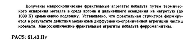 Получены макроскопические фрактальные агрегаты кобальта путем термического испарения металла в среде аргона и дальнейшего осаждения на нагретую (до 1000 К) кремниевую подложку. Установлено, что фрактальная структура формируется в результате действия механизма диффузионно-ограниченной агрегации частиц кобальта. Макроскопические фрактальные агрегаты кобальта ферромагнитны. PACS: 61.43.Hv