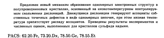 Предложен новый механизм образования одномерных электронных структур в полупроводниковых кристаллах, основанный на низкотемпературном контролируемом скольжении дислокаций. Движущиеся дислокации генерируют ассоциаты собственных точечных дефектов в вид*е одномерных цепочек, при этом низкая температура препятствует распаду ассоциатов. Приведены результаты экспериментов и численных оценок, выполненных для кристаллов сульфида кадмия. PACS: 62.20.Fe, 73.20.Dx, 78.50.Ge, 78.55.Et