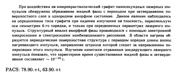 При воздействии на микрокристаллический графит пикосекундных лазерных импульсов обнаружено образование жидкой фазы с переходом при затвердевании поверхностного слоя в однородное аморфное состояние. Данное явление наблюдалось на определенном типе графита при падении излучения на плоскость, параллельную оси симметрии 6-го порядка, и только при определенных параметрах лазерного импульса. Структурный анализ аморфной фазы производился с помощью электронной микроскопии и спектроскопии комбинационного рассеяния. В области нагрева образуется периодическая поверхностная структура с периодом порядка длины волны нагревающего импульса, направление штрихов которой следит за направлением поляризации этого импульса. Изучение кинетики отражения зондирующего лазерного импульса показало, что характерное время существования жидкой фазы и затвердевания составляет ~ Ю-10 с. PACS: 78.90.+t, 63.90.+t