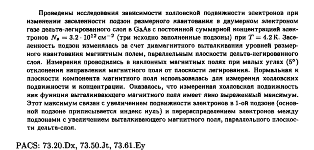 Проведены исследования зависимости холловской подвижности электронов при изменении заселенности подзон размерного квантования а двумерном электроном газе дельта-легированного слоя в GaAs с постоянной суммарной концентрацией электронов N, = 3.2 · 101гсм-2 (три исходно заполненные подзоны) при Τ = 4.2 К. Заселенность подзон изменялась за счет диамагнитного выталкивания уровней размерного квантования магнитным полем, параллельным плоскости дельта-легированного Слоя. Измерения проводились в наклонных магнитных полях при малых углах (5°) отклонения направления магнитного поля от плоскости легирования. Нормальная к плоскости компонента магнитного поля использовалась для измерения холловских подвижности и концентрации. Оказалось, что измеренная холловская подвижность как функция выталкивающего магнитного поля имеет явно выраженный максимум. Этот максимум связан с увеличением подвижности электронов в 1-ой подзоне (основной подзоне приписывается индекс нуль) и перераспределением электронов между подзонами с увеличением выталкивающего магнитного поля, параллельного плоскости дельта-слоя. PACS: 73.20.Dx, 73.50.Jt, 73.61.Еу