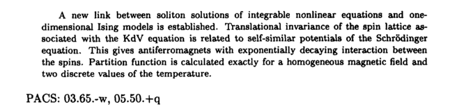 A new link between soliton solutions of integrable nonlinear equations and one-dimensional Ising models is established. Translational invariance of the spin lattice associated with the KdV equation is related to self-similar potentials of the Schrodinger equation. This gives antiferromagnets with exponentially decaying interaction between the spins. Partition function is calculated exactly for a homogeneous magnetic field and two discrete values of the temperature. PACS: 03.65.-w, 05.50.+q