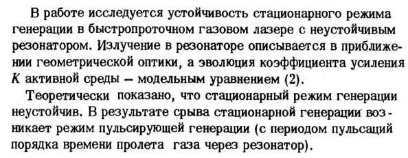 В работе исследуется устойчивость стационарного режима генерации в быстропроточном газовом лазере с неустойчивым резонатором. Излучение в резонаторе описывается в приближении геометрической оптики, а эволюция коэффициента усиления К активной среды модельным уравнением (2). Теоретически показано, что стационарный режим генерации неустойчив. В результате срыва стационарной генерации воз -никает режим пульсирующей генерации (с периодом пульсаций порядка времени пролета газа через резонатор).