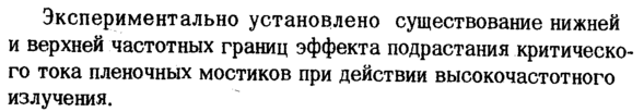 Экспериментально установлено существование нижней и верхней частотных границ эффекта подрастания критического тока пленочных мостиков при действии высокочастотного излучения.