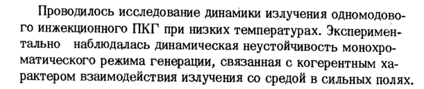 Проводилось исследование динамики излучения одномодово-го инжекционного ПКГ при низких температурах. Экспериментально наблюдалась динамическая неустойчивость монохроматического режима генерации, связанная с когерентным характером взаимодействия излучения со средой в сильных полях.