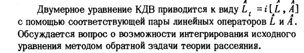 Двумерное уравнение КДВ приводится к виду Lt i [L , A] с помощью соответствующей пары линейных операторов L и А. Обсуждается вопрос о возможности интегрирования исходного уравнения методом обратной задачи теории рассеяния.