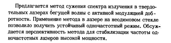 Предлагается метод сужения спектра излучения в твердотельных лазерах бегущей волны с активной модуляцией доб -ротности. Применение метода в лазере на неодимовом стекле позволило получить устойчивый одночастотный режим. Обсуждается перспективность метода для стабилизации частоты од-ночастотных лазеров высокой мощности.
