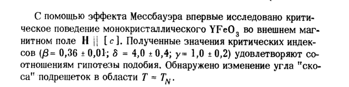 С помощью эффекта Мессбауэра впервые исследовано критическое поведение монокристаллического YFe03 во внешнем магнитном поле Η j| [с]. Полученные значения критических индексов (β= 0,36 ± 0,01; δ = 4,0 ± 0,4; у= 1,0 ± 0,2) удовлетворяют соотношениям гипотезы подобия. Обнаружено изменение угла "скоса" подрешеток в области Τ = ΤΝ.