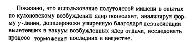 Показано, что использование полутолстой мишени в опытах по кулоновскому возбуждению ядер позволяет, анализируя форму у-линии, допплеровски уширенную благодаря дезэкситации вылетевших в вакуум возбужденных ядер отдачи, исследовать процесс торможения последних в веществе.