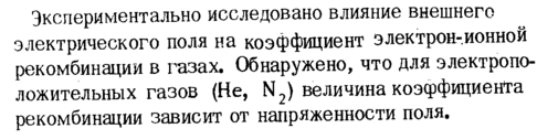 Экспериментально исследовано влияние внешнего электрического поля на коэффициент электрон-ионной рекомбинации в газах. Обнаружено, что для электроположительных газов (Не, N2) величина коэффициента рекомбинации зависит от напряженности поля.