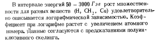 В интервале энергий 50 3000 Гэв рост множественности для разных вешеств (Н8 СН,, Си) удовлетворительно описывается логарифмической зависимостью. Коэффициент при логарифме растет с увеличением атомного номера. Данные согласуются с предсказаниями полуинклюзивного скелинга.